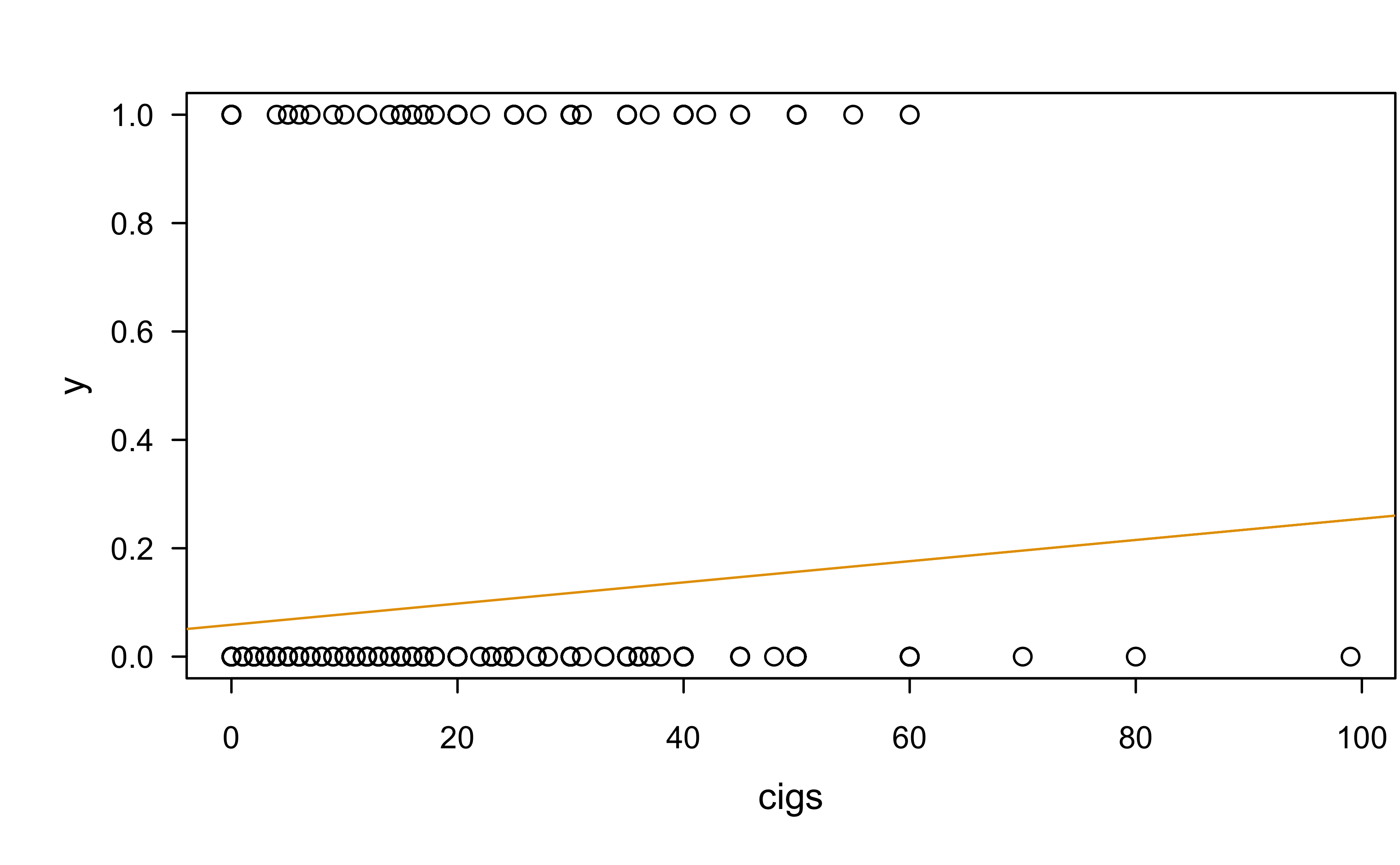 cigs is positively associated with the binary response chdheight is associated with chdRecall that in linear regression we model the conditional mean response as a linear function in some fixed, but known parameters \(\boldsymbol{\beta}\):