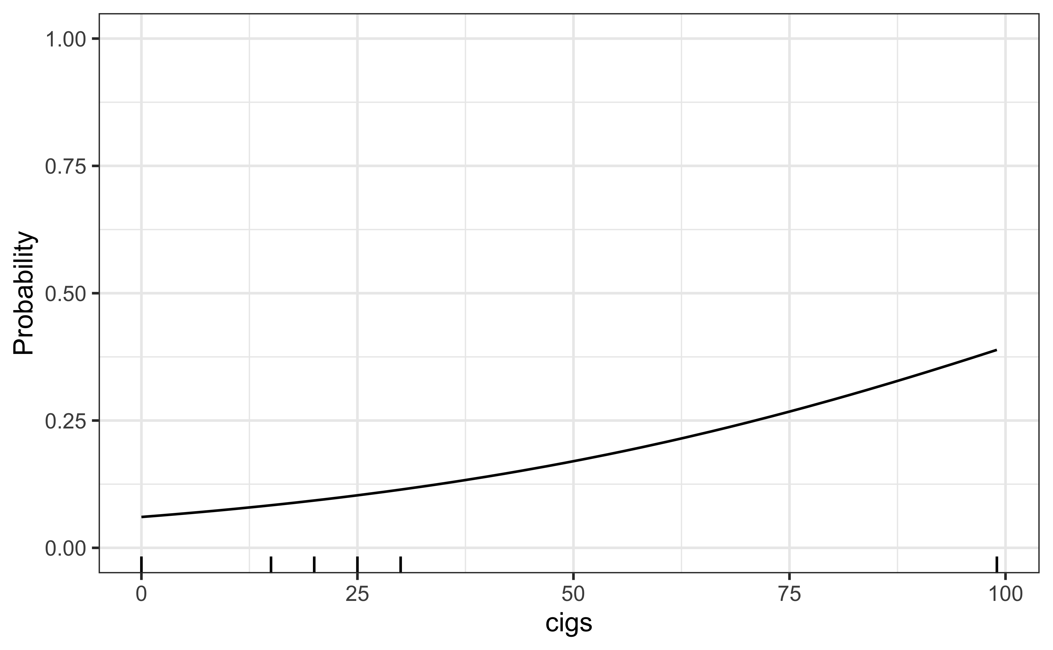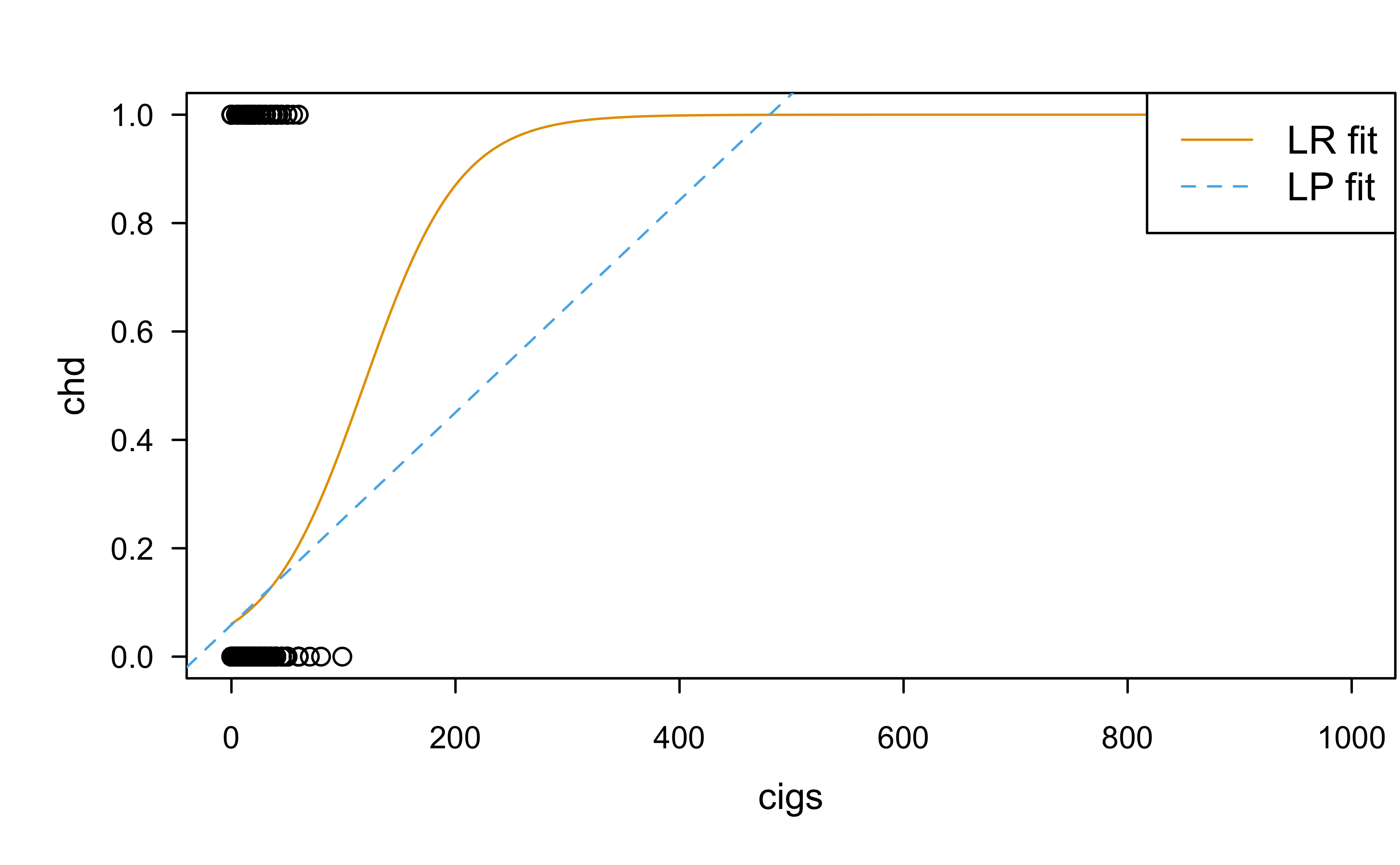chd vs. cigsAssume \(Y \sim \mathrm{Bernoulli}\left(p\right)\), where \[ p = p\left(\boldsymbol{x}\right) = P\left(Y = 1|\boldsymbol{x}\right) = E\left(Y|\boldsymbol{x}\right) \] and \[ \mathrm{logit}\left(p\right) = \log\left(\frac{p}{1-p}\right) = \boldsymbol{\beta}^\top\boldsymbol{x} \] In other words, LR models the logit of the mean response as a linear function in \(\boldsymbol{\beta}\); we’ll refer to the term \(\eta = \boldsymbol{\beta}^\top\boldsymbol{x}\) as the linear predictor. Why does this make more sense?