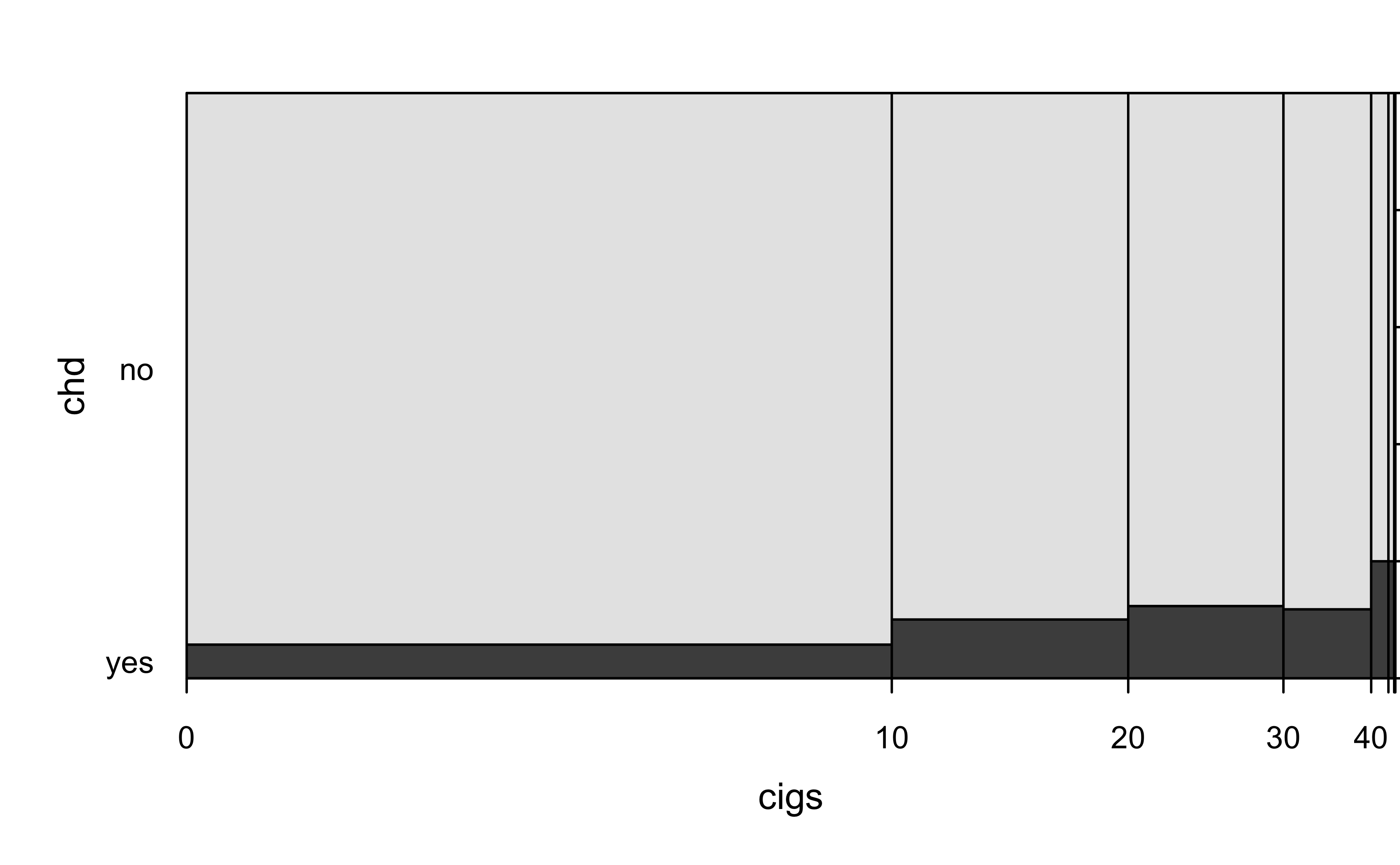 Mosaic plot showing relationship between cigs and chd; not incredibly useful IMO unless both variables are categorical