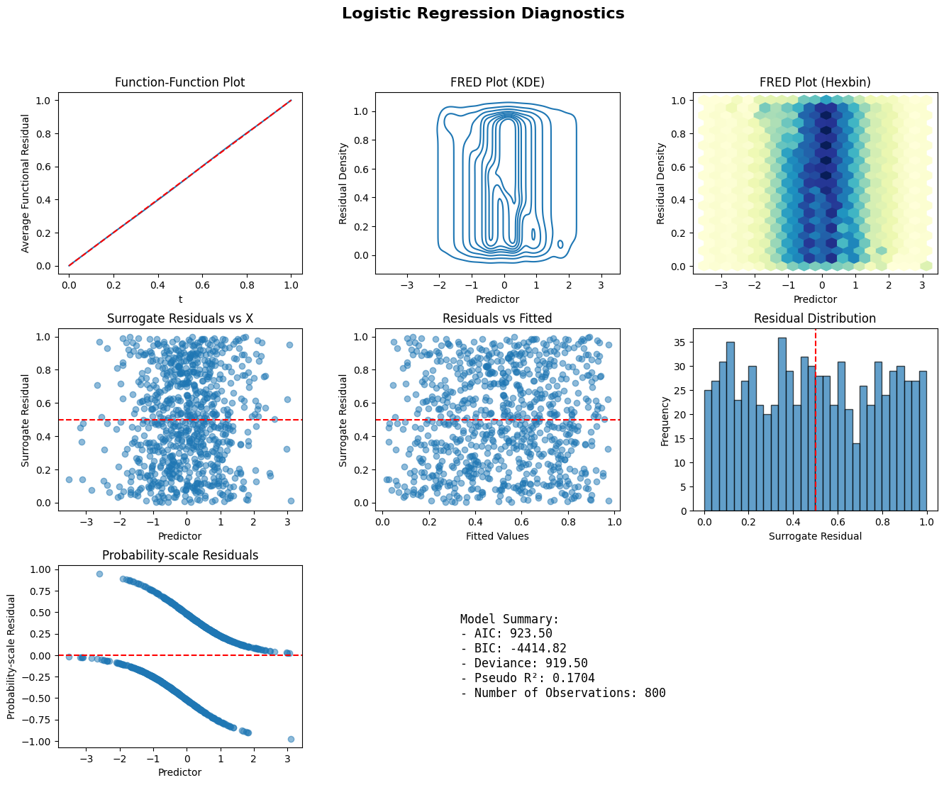 diagnostic_panel(model_diag, x_diag, title="Logistic Regression Diagnostics")